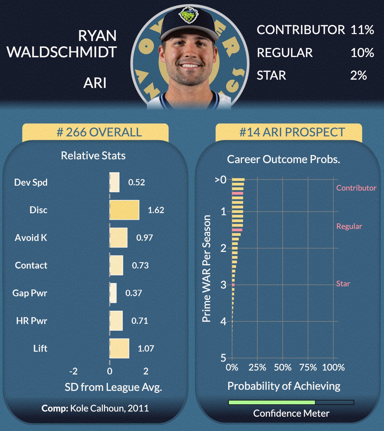Where does reality lie between our bearishness and BA’s bullishness? Well, of course, we’ll say it’s closer to our end. Floor-wise, we’re probably too low on Waldschmidt. He seems like a lock to make some sort of impact in the show, and that is not reflected in our probabilities, which don’t like a 22-year-old spending all that time below Double-A. We think our evaluation of his shot of being an impact regular or star, though, is pretty spot on. As a corner outfielder, this guy has to hit to generate WAR. He’s shown that he’s a good Double-A hitter at a reasonable age, but that’s not the profile of a guy who is a shoo-in to knock the cover off the ball in the show. It could certainly happen, but we stand by our model, which sees it as more of a possibility than a probability.