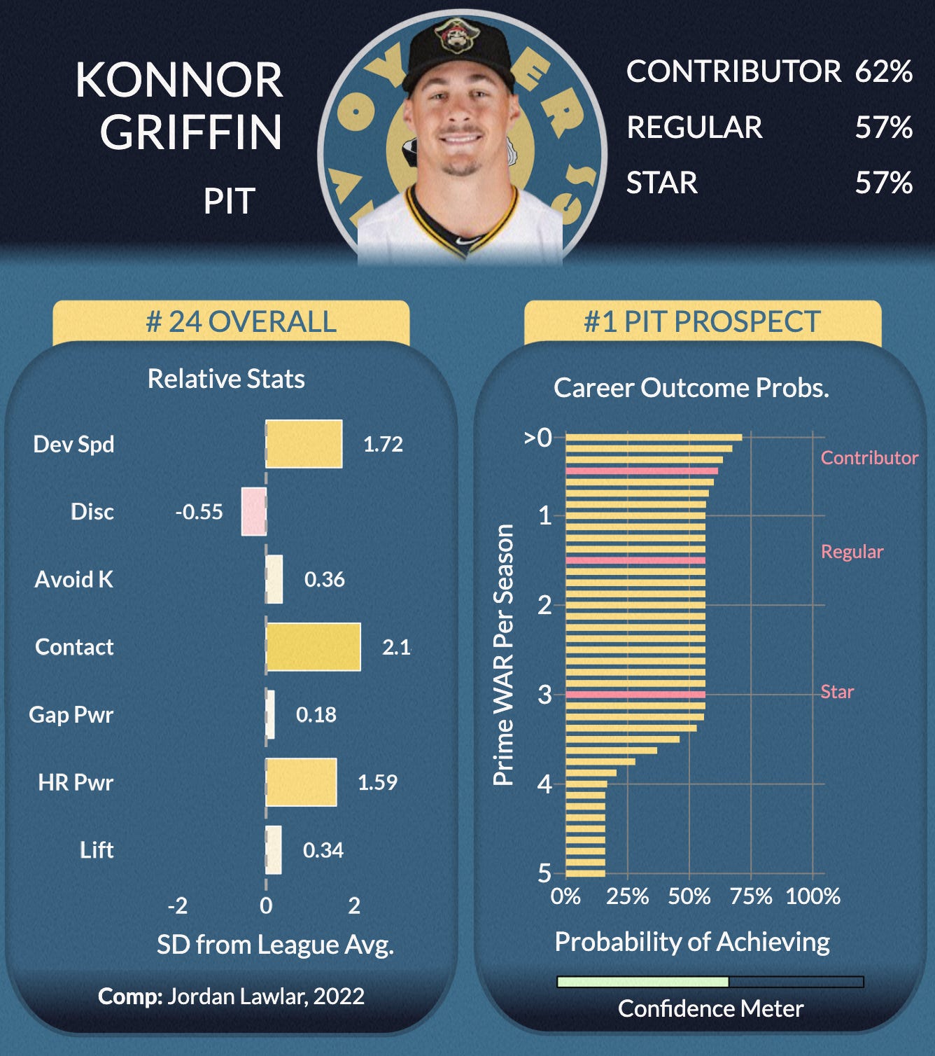 While we do think there’s some risk to Griffin’s walk-unfriendly approach as he reaches the higher levels, even if our model isn’t sold, we’d easily have Griffin in our personal top-5s, if not number one. He certainly has the highest ceiling of any prospect since… Buxton? Harper? For now, our model (and we) will have to deal with the reputational hit of having Griffin at 24 overall.