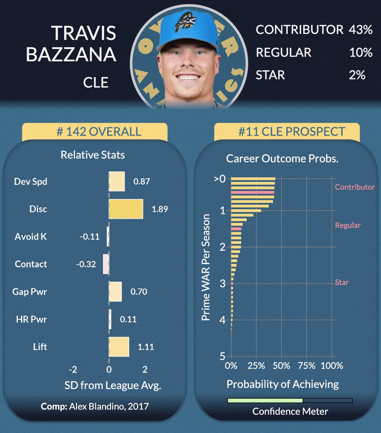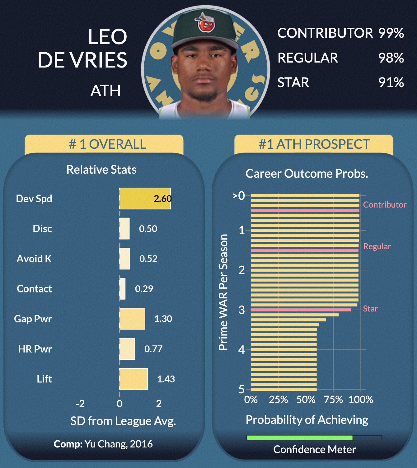 In all, we’re confident that our model’s caution is warranted and accurately holds down Bazzana’s 50th percentile future value and his ceiling. There’s probably something to be said for a manual elevating of his “Contributor” status, though. We’ve got that at 43%, but the confidence on the scouting side that this is an MLB player suggests that Bazzana is indeed probably more likely than not to make an impact in the show.