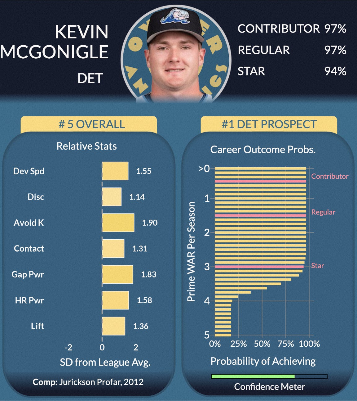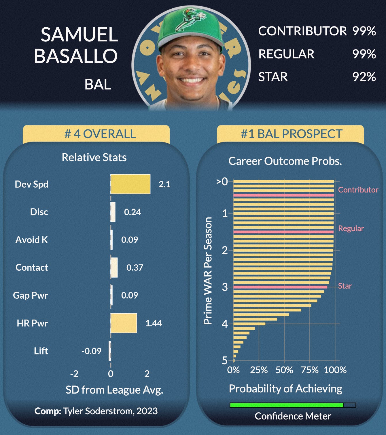 What more can we say? Plenty, but we’ll keep it short. McGonigle is the platonic ideal of the Pure Hitter archetype, and our conviction in him is further strengthened by the fact that scouts have come around as well. Did we mention his 162 wRC+ in Double-A came despite a hugely unlucky .230 BABIP? When that regresses (progresses?) to the mean, yeesh. Nobody is a sure thing, but we have McGonigle at a 94% chance to be a Star by our standards, which, combined with the full-throated BA endorsement, gives this guy the bluest chip he could hope for.