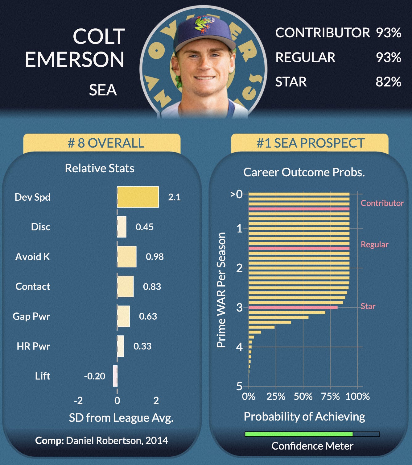 In cases where injuries have taken a major toll on players, it’s worth considering what the scouts have to say even more than usual. In the case of Colt Emerson, whom we detailed earlier, scouts and our model stuck with him. Here, Arroyo has only the support of the numbers. In cases where major external factors are at play, and a model is extremely high on a player, but scouts are not, it’s often more useful to think of the model’s view as “what could be,” not “what will likely be”.